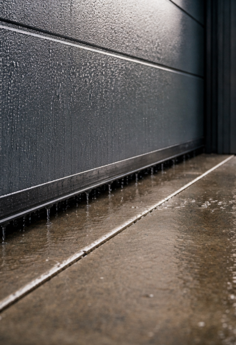 Če obstaja zamakanje, je to prvi popravek. Žlebovi morajo odvajati vodo stran od temeljev, padci terena naj ne usmerjajo vode proti garaži, stik med tlakom in steno mora biti izveden tako, da voda ne šprica neposredno v fasado. Pri garažnih vratih je kritičen spodnji stik. Obrabljeno tesnilo ali previsok prag, kjer se voda zadržuje, lahko povzroči stalno vlažen pas in s tem plesen na notranji strani.
